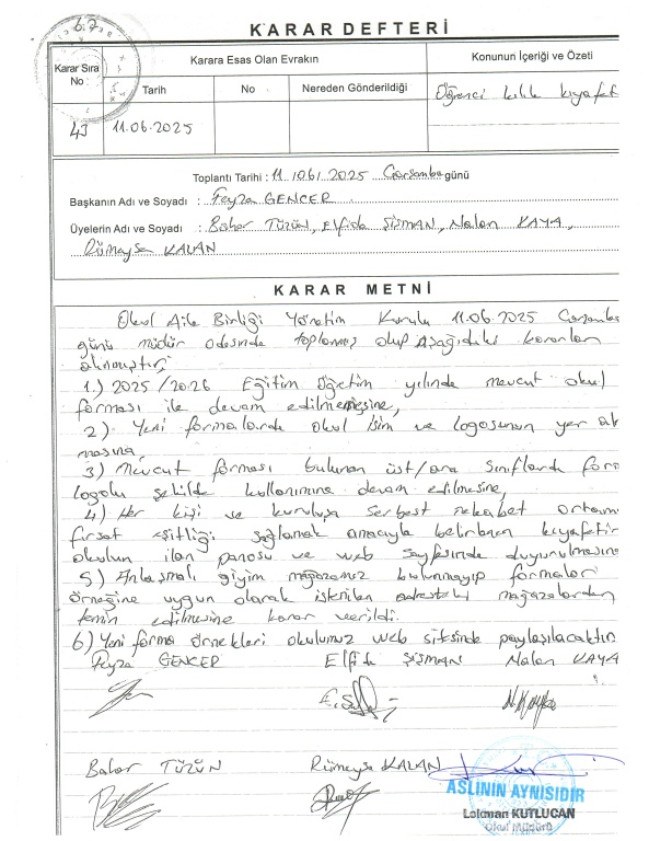 12 Haziran 2025 tarihinde "MEB 06.12.2024 tarihli Milli Eğitim Bakanlığına Bağlı Öğrencilerin Kılık ve Kıyafetlerine Dair Yönetmelik " gereği toplanan okul aile birliğinin aldığı karar doğrultusunda öğrenci kıyafetleri şu şekilde olacaktır.